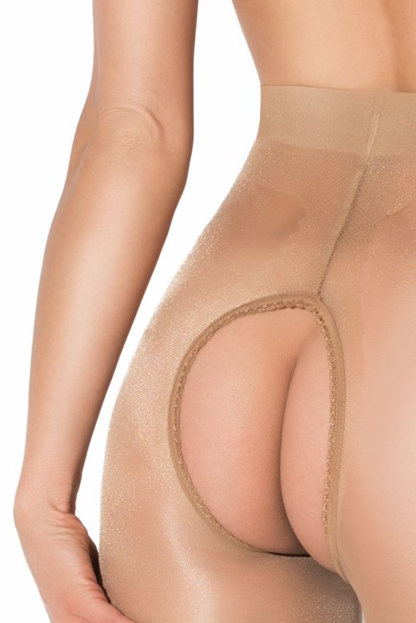 Elegante Ouvert Glanzstrumpfhose mit offenem Schritt und dekorativer Borte. Hergestellt aus hochqualitativen italienischen Garnen. 20 DEN