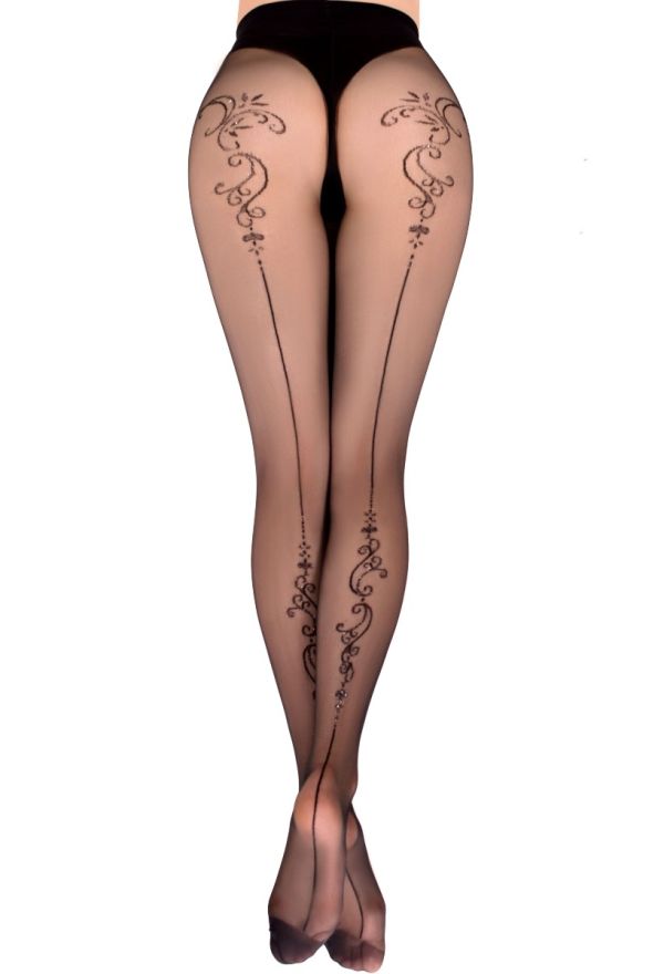 Elegante schwarze Feinstrumpfhose mit Naht und Muster (Lurex-silber). 20 DEN