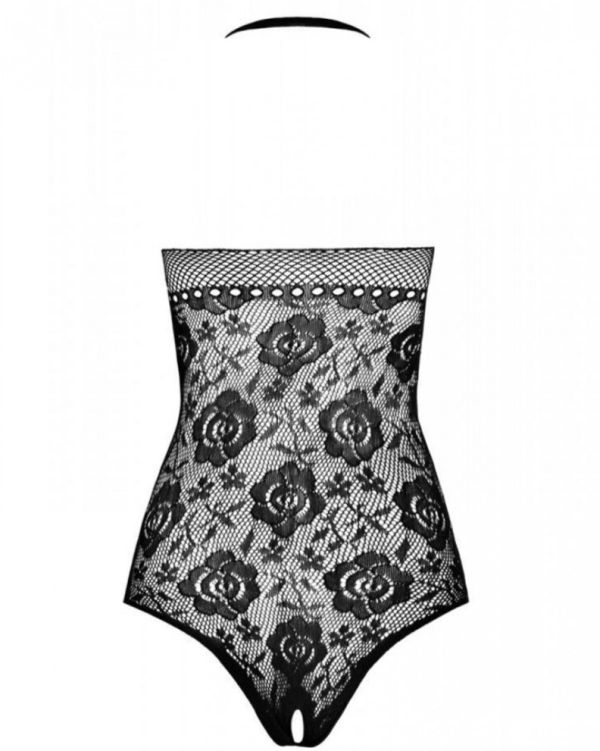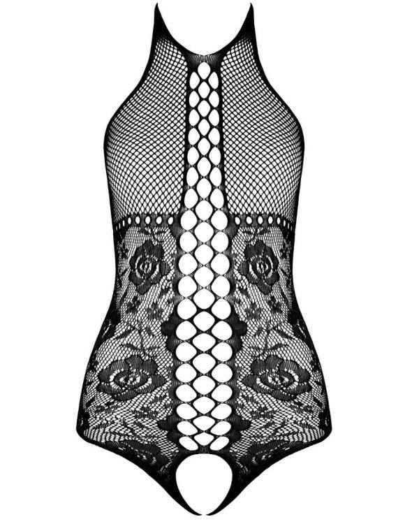 Schwarzer Netzbody mit offenem Schritt aus elastischem Material.