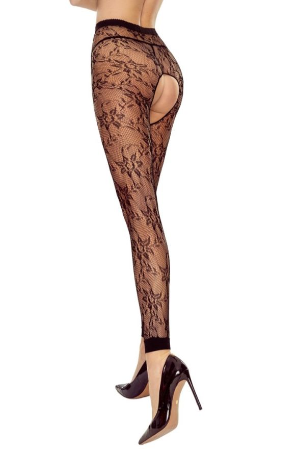 Sexy schwarze Netzstrumpfhose mit Muster in Leggings-Look, offen im Schritt.